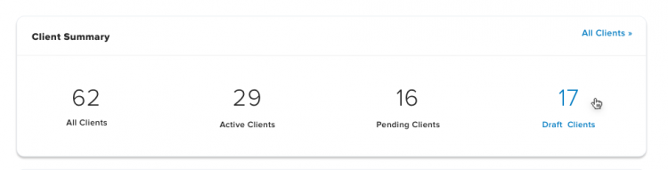 In order to make your Dashboard easier to use, we have added the ability for you to click on any category in the client summary and immediately be able to see a corresponding list of clients. You may also notice a new field, “Draft Clients.”