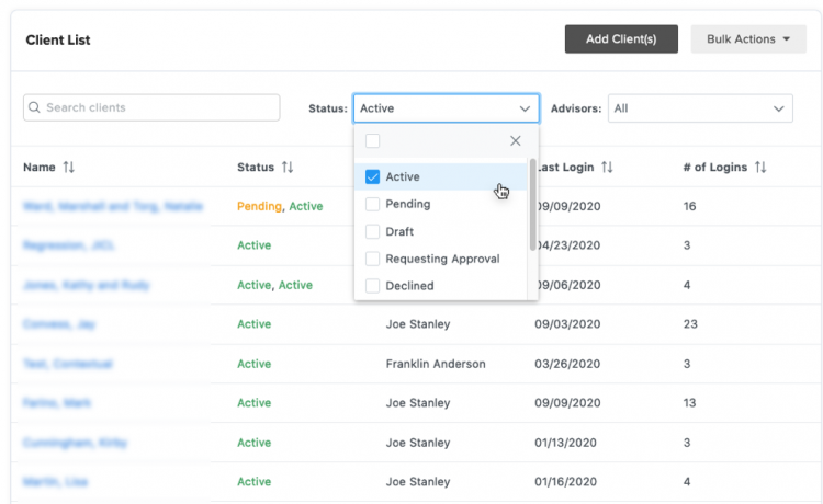 We made a number of updates to the Client List. You’ll now be able to filter your clients by status and assigned advisor. Sorting and search features remain intact. Your client list will be paginated if you have more than 20 clients. In addition, we made infrastructure updates so the list will display faster. We hope these new features allow for easier navigation and a better user experience.